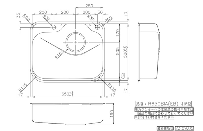 | 商品名 | アドバンスシンク(エンボス仕上げ) R650BIA-EB ●W650×D505/520×H190 |