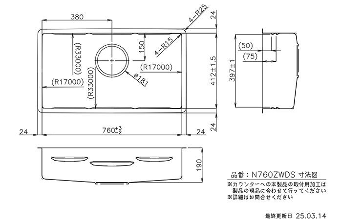 | 商品名 | プレミアムシンク(リブ3本) N760ZWDS ●W760×D410×H190 |