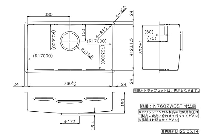 | 商品名 | プレミアムシンク(リブ3本、フィット排水) N760ZWDST ●W760×D410×H190 |